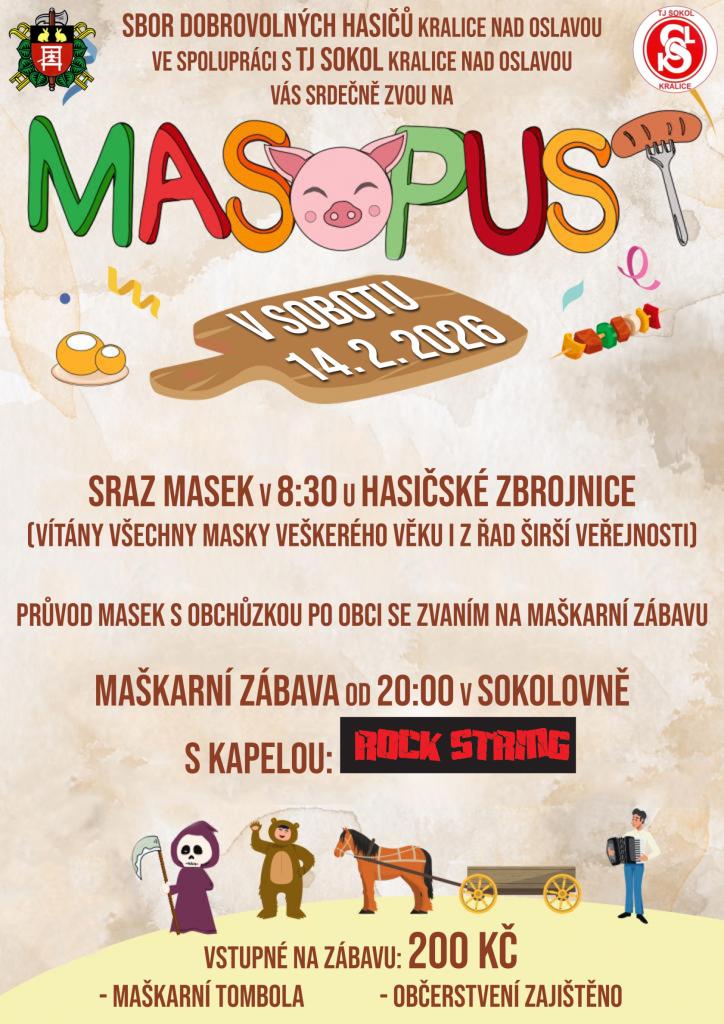 SDH Kralice nad Oslavou ve spolupráci s TJ Sokol Kralice nad Oslavou Vás srdečně zvou na MASOPUST 2026 v sobotu 14.2.2026 a současně si Vás dovolují poprosit o přispění věcných darů do tomboly