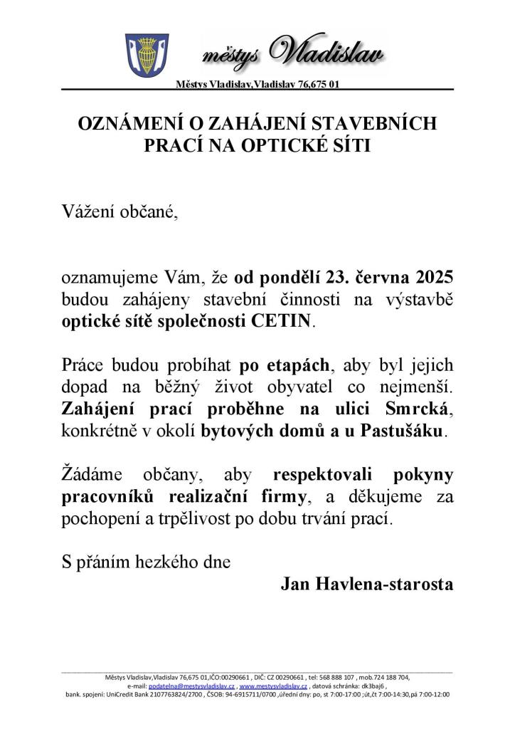 OZNÁMENÍ O ZAHÁJENÍ STAVEBNÍCH PRACÍ NA OPTICKÉ SÍTI